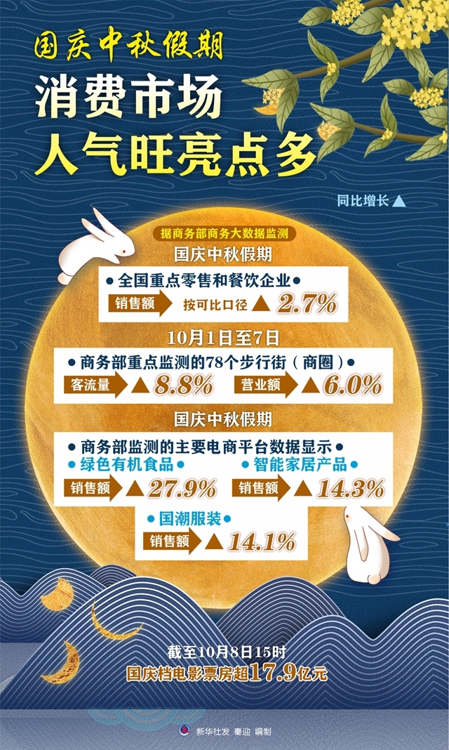 据商务部商务大数据监测,国庆中秋假期全国重点零售和餐饮企业销售额按可比口径同比增长2.7%。10月1日至7日,商务部重点监测的78个步行街(商圈)客流量、营业额同比分别增长8.8%和6.0%。